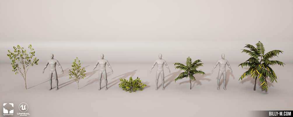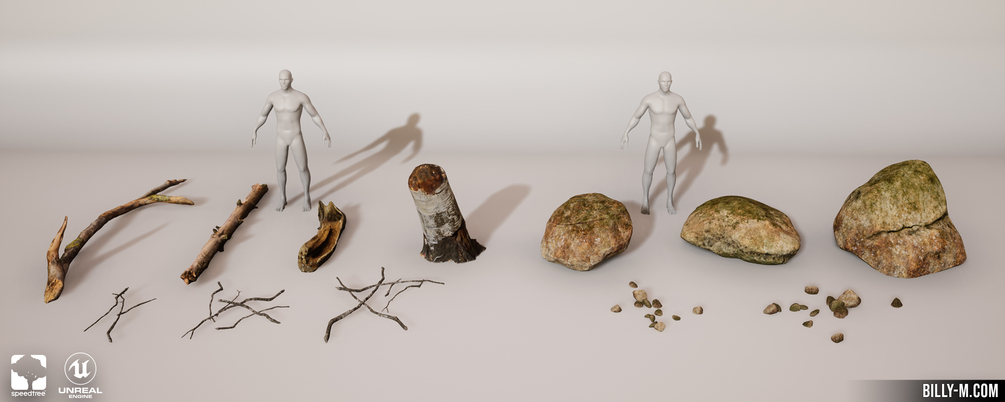 All assets were roughly built to the higher end of current video game budgets. (For example, the trees range from 13k - 30k triangles, rocks range from 2k - 5k triangles.)