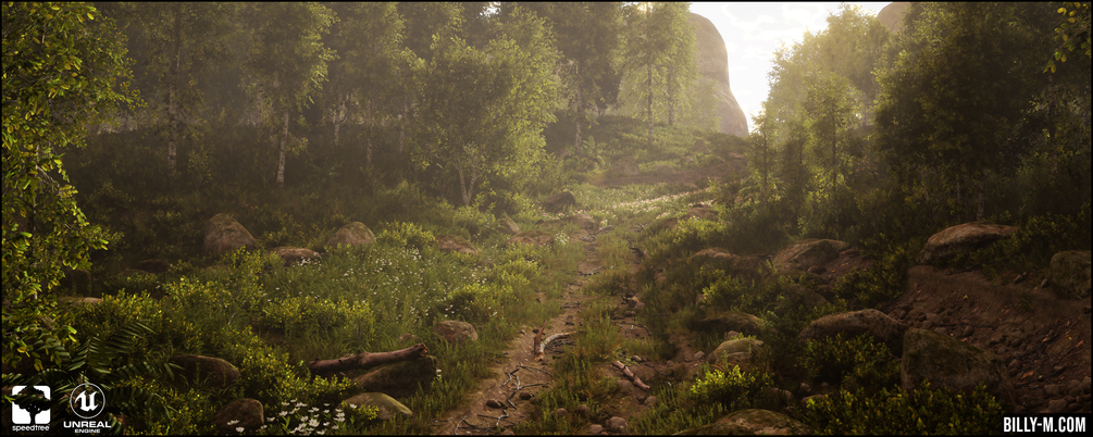All the vegetation in the project was modeled exclusively in SpeedTree, from high to low poly. The assets and textures in the scene are built using my own personal scanned data, processed in Agisoft Photoscan, while certain elements such as rocks, clutter and terrain materials were built using a mix of my own personal scanned data, Substance, ZBrush, and traditional modeling & texturing techniques.
