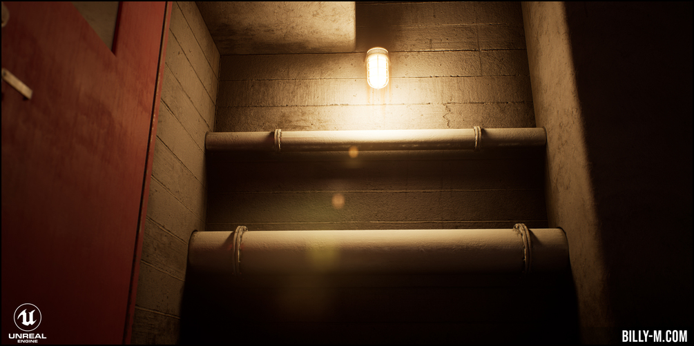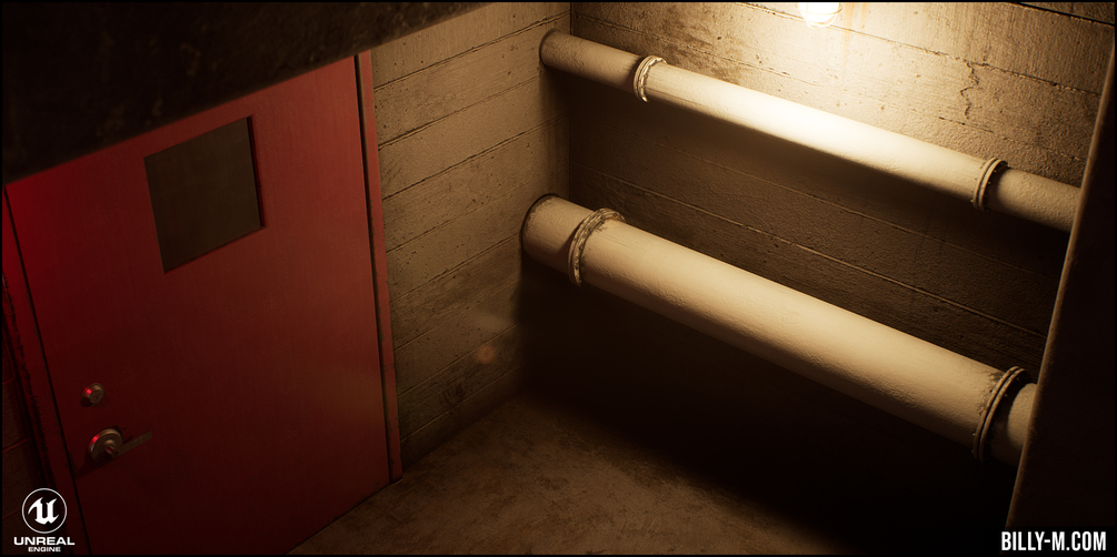 All structural and props in the environment are modelled with face-weighted normals, and textured with only tiling materials (built in Substance Designer), blend masks and decals.